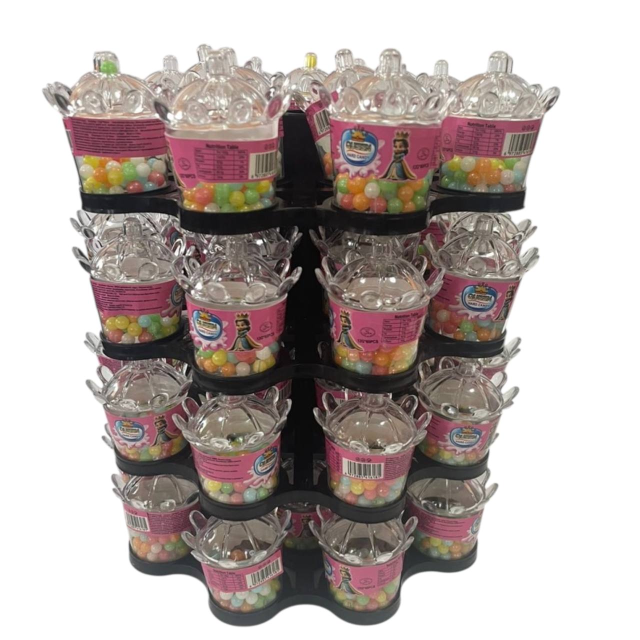 Яскраве різнокольорове фруктове драже в оригінальній упаковці у вигляді корони стане чудовими ласощами для дітей. Зручний формат дозволяє легко продавати поштучно, а барвиста стійка привертає увагу покупців.