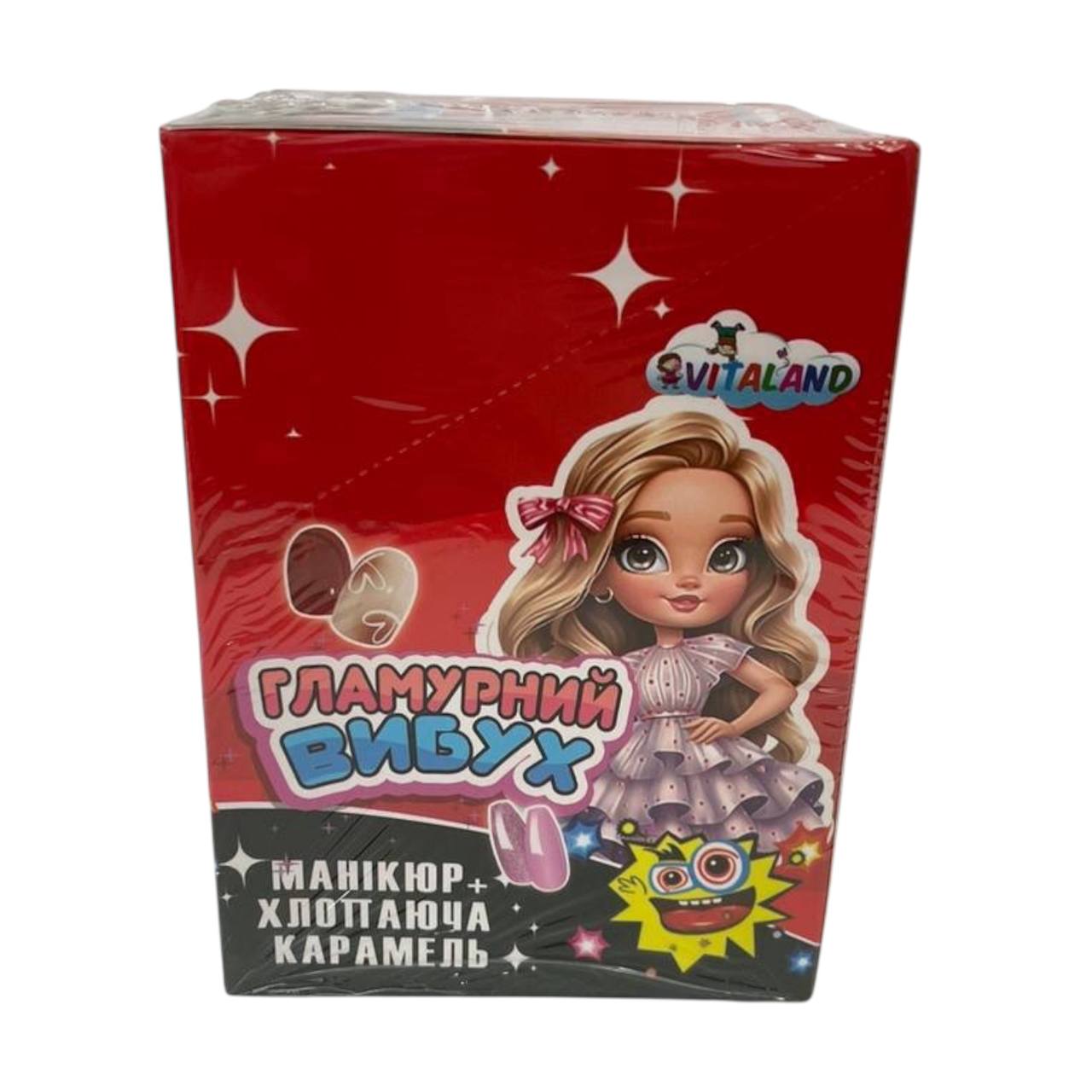У кожній упаковці – стильний міні-набір для манікюру з барвистими наклейками та смачною хлопаючою карамеллю, яка створює ефект справжнього вибуху смаку!